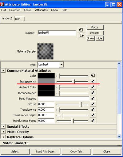 [マテリアルAttribute Editor]の[Transparency]のつまみを半分ぐらいにして半透明にします。